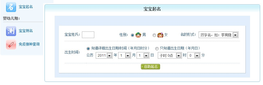 這樣寶寶樹的用戶,那些年輕的媽媽、爸爸們就可以使用美名騰網站提供的起名測名信息服務 (鏈接地址為: http://www.babytree.com/know/tools.php 歡迎大家訪問!),其中包括寶寶起名,寶寶測名兩大最受歡迎的起名測名功能。