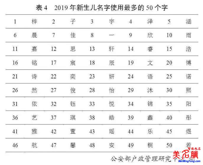 2019年出生并已經(jīng)進(jìn)行戶籍登記的新生兒名字中,使用頻率最高的50個(gè)字依次為: