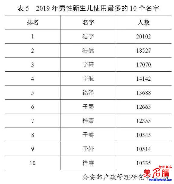 2019年出生并已經(jīng)進(jìn)行戶籍登記的男性新生兒中,使用頻率最高的10個(gè)名字依次為:“浩宇”“浩然”“宇軒”“宇航”“銘澤”“子墨”“梓豪”“子?!薄白榆帯薄拌黝!?。與2018年相比,“銘澤”“子墨”“子睿”“梓?!边M(jìn)入前十。