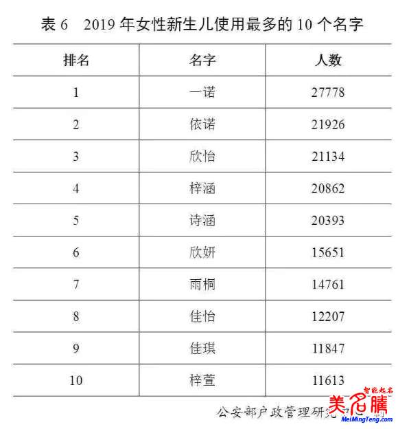 2019年出生并已經(jīng)進(jìn)行戶籍登記的女性新生兒中,使用頻率最高的10個(gè)名字依次為:“一諾”“依諾”“欣怡”“梓涵”“詩(shī)涵”“欣妍”“雨桐”“佳怡”“佳琪”“梓萱”。與2018年相比,“佳琪”進(jìn)入前十。