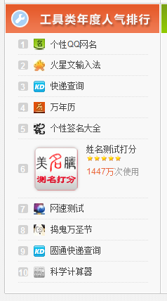 美名騰的工具類(lèi)應(yīng)用, 包括姓名測(cè)試打分、起名工具、起英文名、寶寶起名等,作為自2009年首批上線(xiàn)的百度應(yīng)用,在2010進(jìn)入百度十大應(yīng)用排行榜。美名騰“姓名測(cè)試打分”今年又獲百度工具類(lèi)應(yīng)用人氣排行榜第六名 http://app.baidu.com/static/cms/albums/topapp2011.html#tool。