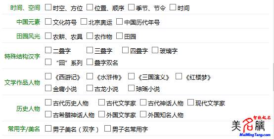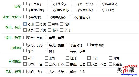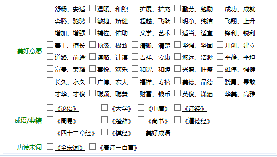 在科學(xué)技術(shù)以及計(jì)算機(jī)信息技術(shù)飛速發(fā)展的今天,您再也不需要去一一翻閱各種詩詞古籍,借助美名騰智能起名強(qiáng)大的功能,你可以很快從喜歡的詩詞古籍中找到滿意的名字。而且還能兼顧傳統(tǒng)的:五行八字,五格數(shù)理,生肖等起名方法。起名的時(shí)候只要根據(jù)您的喜好,選擇某一個(gè)或者某幾個(gè)類別,就可以得到相應(yīng)類別的名字。名字很多,需要不斷的嘗試,即可取出美好意愿有出處的好名字!