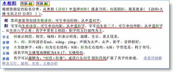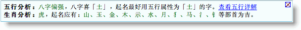 3、根據(jù)分析所得的信息,綜合起出滿足用戶個(gè)性化意愿,寶寶出生時(shí)間、地點(diǎn)信息,傳統(tǒng)的五行、生肖、五格,以及音韻、意蘊(yùn)優(yōu)美的名字。如下是其中的一個(gè)候選名字