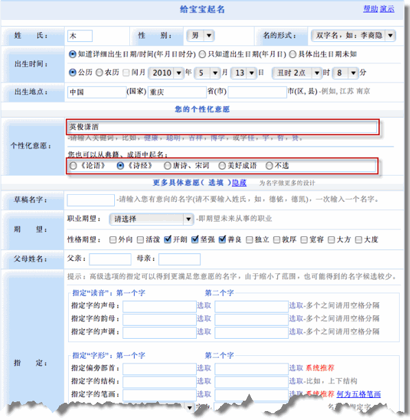 1、輸入如下所示的起名基本信息。注意:個(gè)性化意愿選擇從典籍《詩(shī)經(jīng)》中起名
