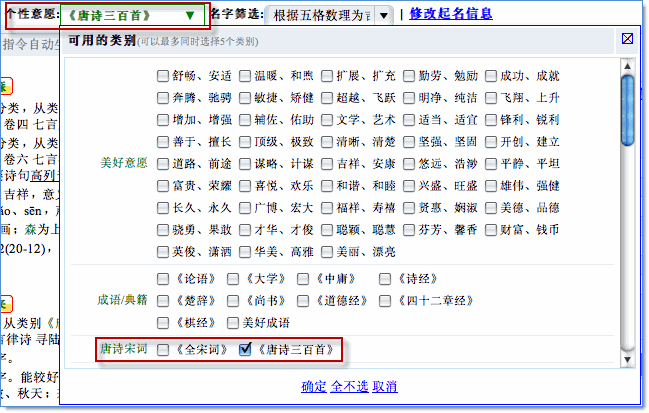 2、美名騰為您準(zhǔn)備了上百個(gè)起名個(gè)性化意愿類別,本例中選擇類別《唐詩三百首》,如下圖所示