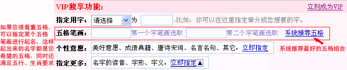 如果您是自助起名VIP會(huì)員,還可以通過以下方法指定想要的五格: