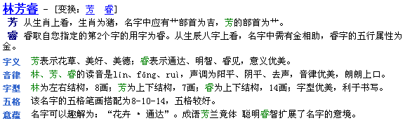 4. 在系統(tǒng)為您重新起出的名字候選中,即可獲得符合心意的候選名字。第7個(gè)候選名字就是“林芳睿”。以下是候選名字“林芳?!钡慕忉屝畔?。