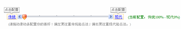 3. 點(diǎn)擊“起名”按鈕起名,在候選名字頁面的最上方,通過滑動(dòng)條調(diào)整傳統(tǒng)和現(xiàn)代兩種起名法的平衡。為了更多地考慮五格信息,可以將滑動(dòng)條調(diào)整到最左邊,如下圖所示。