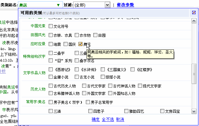 2. 點(diǎn)擊“起名”按鈕起名,在頁面上方的“類別起名”中選擇“奧運(yùn)”,再點(diǎn)擊“確定”按鈕。如下圖所示。