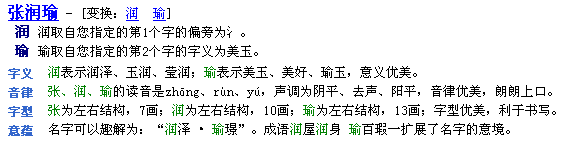 3. 點(diǎn)擊“起名”按鈕起名,即可獲得符合上述要求的候選名字。第20個(gè)候選名字就是“張潤瑜”。以下是候選名字“張潤瑜”的解釋信息。