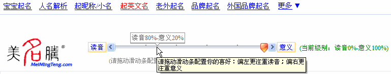 這兩種起名法,您完全可以得兼。使用美名騰起英文名系統(tǒng)提供的讀音、意義配置工具,您可以在讀音與意義之間尋找一個(gè)合適的平衡點(diǎn)以獲得滿意的英文名。如下圖所示。