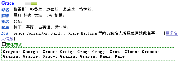 2. 點(diǎn)擊“提交”按鈕,系統(tǒng)即可為您起出符合要求的英文名。以下是英文名“Grace”的解釋信息。
