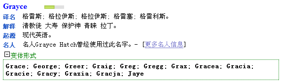• 根據(jù)中文姓名起英文名:系統(tǒng)會根據(jù)您的中文名,起出與中文名發(fā)音一致或接近,或者與中文名部分發(fā)音一致或接近的英文名。例如,“葛蕾思”,對應(yīng)的英文名為“Grace”或“Grayce”。