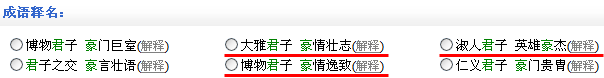 | 成語是自古至今形成的一些固定結(jié)構(gòu)和固定含義的詞組或短語,絕大多數(shù)都是四字格。很多父母當初在為孩子起名時,可能是通過成語精選出來的。此外,平時我們在介紹自己名字時,總希望別人能體會到該名字蘊涵的文化氣息和高雅內(nèi)涵,從而給人留下更深刻的印象。把自己的名字通過一個或兩個成語解釋出來,就能達到這個效果。美名騰人名解析系統(tǒng)為您提供了強大的成語釋名功能,方便您為自己的名字選出最貼切的成語解釋。下圖顯示了“君豪”這個名字的成語釋名信息。