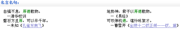 | 使用人名解析系統(tǒng),用戶可以找到一句最合適解釋自己名字的名言或趣解,方便在給別人介紹自己名字時使用,從而易于其他人記憶自己的名字。下圖分別顯示了名字“春風”及“厚德”的趣解和名言信息。