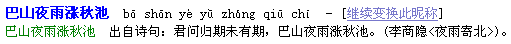 2. 點(diǎn)擊“提交”按鈕,系統(tǒng)即可為您起出符合要求的名字。以下是名字“巴山夜雨漲秋池”的解釋信息。