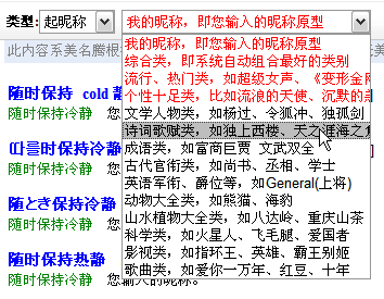 在網(wǎng)絡(luò)江湖上行走,擁有一個(gè)酷的昵稱,會(huì)增加不少點(diǎn)擊率。但是起個(gè)好昵稱并不是一件容易的事情,因?yàn)楹玫年欠Q背后往往透射著智慧和格調(diào)。美名騰起昵稱系統(tǒng)能夠讓您輕松起出超酷昵稱。起昵稱時(shí),建議您輸入全部信息,這樣美名騰起昵稱系統(tǒng)就可以根據(jù)您的信息起出與您最貼切的昵稱。此外,您還可以根據(jù)喜好,對(duì)昵稱的嚴(yán)謹(jǐn)和詼諧程度進(jìn)行控制。下面兩幅圖分別顯示了使用類別起昵稱及控制嚴(yán)謹(jǐn)、詼諧程度的過(guò)程。
