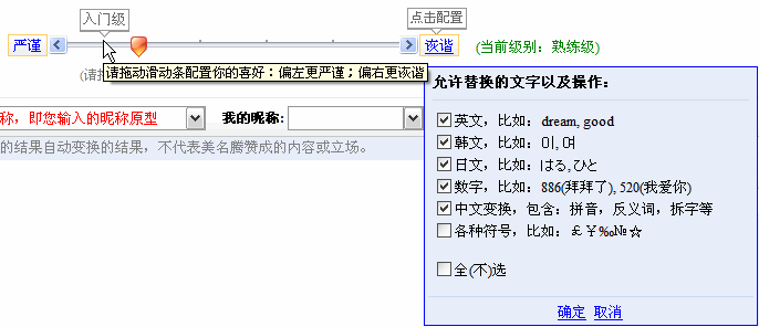 - 起昵稱系統(tǒng)創(chuàng)造性地將嚴(yán)謹(jǐn)與詼諧兩種起昵稱風(fēng)格進(jìn)行了有機(jī)融合。用戶可以拖動(dòng)滑動(dòng)條以配置嚴(yán)謹(jǐn)與詼諧這兩種風(fēng)格的平衡。