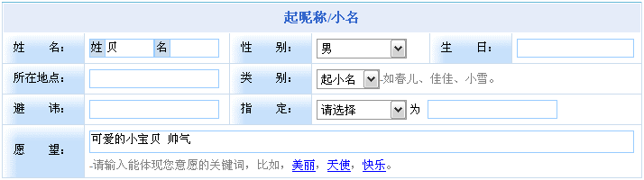 1. 在輸入信息中將姓氏填上,并在愿望中輸入“可愛(ài)的小寶貝 帥氣”。如下圖所示。