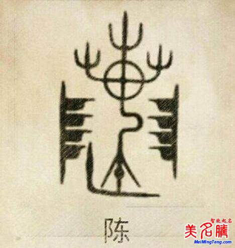 陳姓圖騰的產(chǎn)生,先從陳字說起。陳字的含義之一是陣列。陳字在古代與陣字相通,故古代陳字意義之一為陣列,即旌旗之下,戰(zhàn)車、士兵列陣于國土待戰(zhàn)出征。史載:是黃帝發(fā)明了古代高輪車,高輪車成為黃帝部落的象征,故黃帝又稱軒轅氏。而陳氏是黃帝后裔,自然與車有關;加之陳姓形成那個時代,即陳國建國初期,陳胡公是周武王乘龍快婿,陳國與周王朝關系甚密,陳國軍隊常被周天子派遣,去征戰(zhàn)入侵的東夷、南蠻、西戎、北狄和周王朝內(nèi)反叛的諸候國,干戈擾攘,征戰(zhàn)不息。旌旗飄揚、鼙鼓聲震、戰(zhàn)車轔轔、戰(zhàn)馬蕭蕭、兵士整裝持戟、車馬列隊待發(fā)之場面,成了陳國象征性的壯景。陳姓在這個時期形成,陳姓圖騰也就此產(chǎn)生。