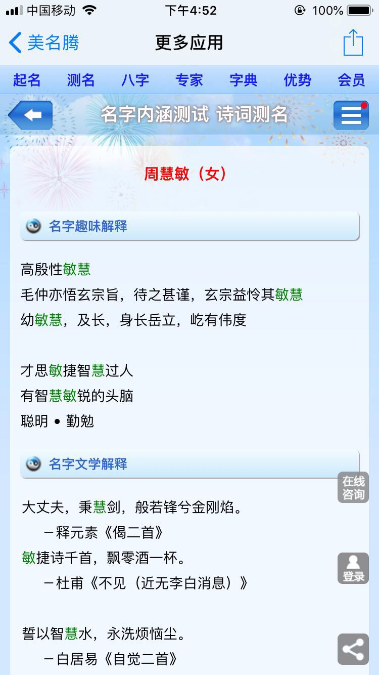 對(duì)于普通人來(lái)說(shuō),想要短時(shí)間想到這么多文化素材不是易事。但大家都希望讓自己的名字解釋出來(lái)比較有內(nèi)涵,那怎么辦呢?美名騰借助大數(shù)據(jù)技術(shù),給大家?guī)?lái)姓名內(nèi)涵測(cè)試分析工具,可以從多個(gè)維度分析測(cè)試名字的文化內(nèi)涵。這個(gè)工具免費(fèi)開(kāi)放給需要起名、測(cè)名的朋友使用。為了方便大家使用,手機(jī)電腦都可以用。手機(jī)版內(nèi)涵測(cè)試地址:https://m.meimingteng.com/m/qujiemingzi.aspx 電腦版姓名內(nèi)涵測(cè)試地址:http://m.dieucafe.com/Tool/Poem.aspx http://m.dieucafe.com/Tool/Idiom.aspx