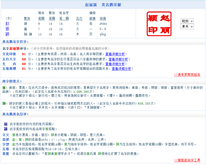 從晴兒、陸貞再到杉杉、花千骨,趙麗穎一直在進步,回看一些曾經大火的女演員,除了人氣、演技,有一部大熱的代表作是非常重要的,顯然《花千骨》就是趙麗穎的代表作。因此《花千骨》讓趙麗穎人氣暴漲,成為炙手可熱的當紅小花旦。下面我們從姓名學的角度簡單分析一下趙麗穎的名字,看看趙麗穎的名字到底怎么樣?說明:由于只知道趙麗穎出生的年月日,具體時辰不知道,故八字分析部分僅供參考。