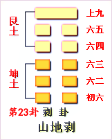 這個卦是異卦(下坤上艮)相疊。五陰在下,一陽在上,陰盛而陽孤;高山附于地。二者都是剝落象,故為“剝卦”。此卦陰盛陽衰,喻小人得勢,君子困頓,事業(yè)敗壞。