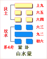 這個(gè)卦是異卦(下坎上艮)相疊,艮是山的形象,喻止;坎是水的形象,喻險(xiǎn)。卦形為山下有險(xiǎn),仍不停止前進(jìn),是為蒙昧,故稱蒙卦。但因把握時(shí)機(jī),行動(dòng)切合時(shí)宜,因此,具有啟蒙和通達(dá)的卦象。